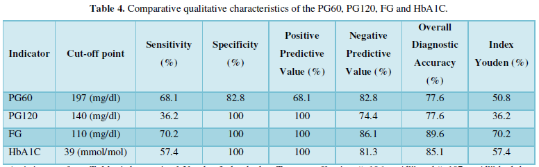 As it is seen from Table 3 the minimal Youden Index had PG60 cut-off point “≥155 mg/dl” (20.9 %). The Youden Index was increasing until “≥197mg/dl” cut-off point, and was decreasing after “≥198 mg/dl” cut-off point. Optimal cut-off points for PG60 by Youden index are “≥196 mg/dl” and “≥197 mg/dl”, they are close to the cut-off point “≥198 mg/dl” (which was calculated by the multiple regression equation). Therefore, cut-off points “≥196 mg/dl” or “≥197 mg/dl” are differed by higher Sensitivity (68.1%), Specificity (82.8%), Positive Predictive Value (68.1%), Negative Predictive Value (82.8%), Overall Diagnostic Accuracy (77.6%). Table 4 shows the comparative qualitative characteristics of the PG60, PG120, FG and HbA1C.