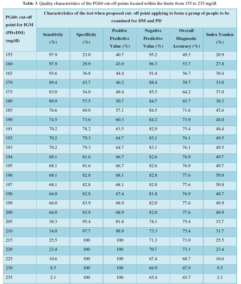 Quality characteristics of the PG60 cut-off points located within the limits from 155 to 235 mg/dl are shown in Table 3.