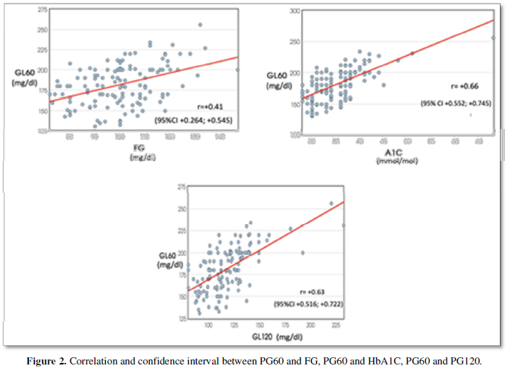 Results: The relationship between PG60 and HbA1C, PG60 and FG, PG60 and PG120 was studied by using correlation analyses. We also studied the relationship between PG60 and HbA1C (r=+0.66 [95%CI +0.552, +0.745]), Gl60 and FG (r=+0.41 [95%CI +0.264, +0.545]) was as well as between PG60 and PG120 (r=+0.63 [95%CI +0.516, +0.722]). All of three correlation coefficients were statistically significant, p
