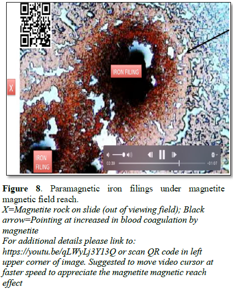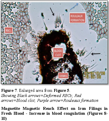 Magnetite Magnetic Reach Effect on Iron Filings in Fresh Blood - Increase in blood coagulation (Figures 8-10)
