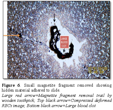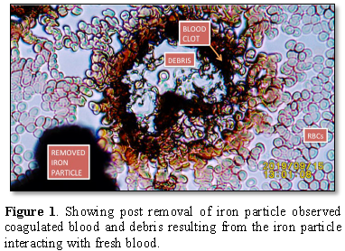 The dual effect of metal iron filings on fresh blood - Compressed blood tissue identified as blood clots (Figure 1)