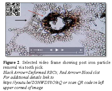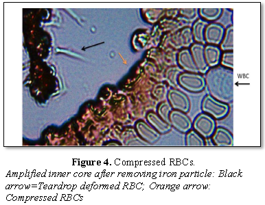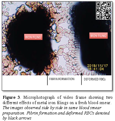 The dual effect of metal iron filings on fresh blood - The demonstration of cells deformation by iron particles in fresh blood (Figure 2)