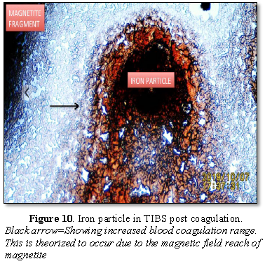 Subsequent experiments with magnetized magnetite rocks fragments showed not only color changes displays throughout the coagulation stage; but ultimately an increase in coagulated blood surrounding the magnetized fragments and Figures 5-7 and video links.