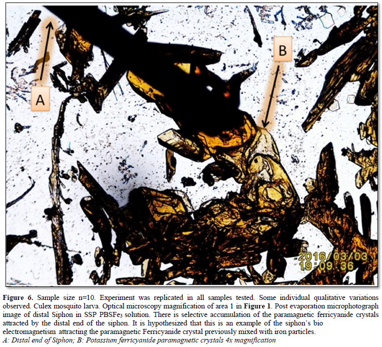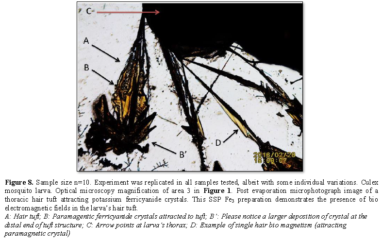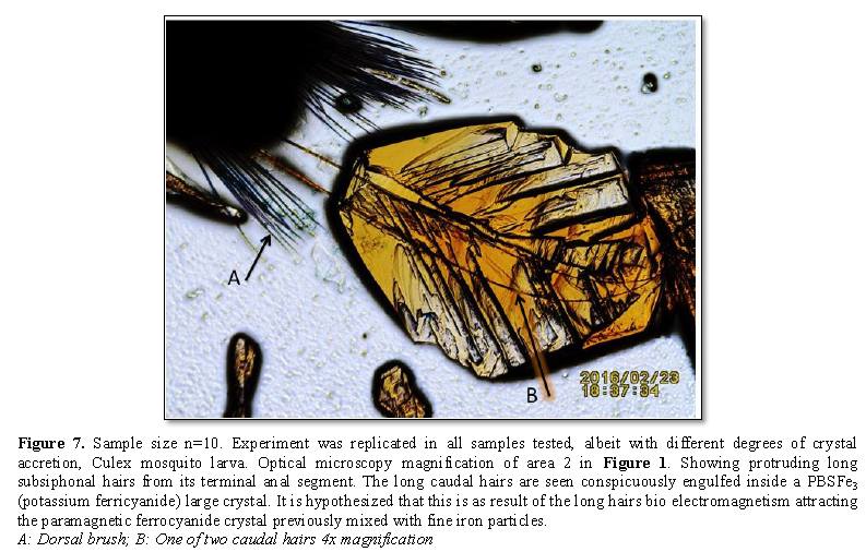 A visual inspection of the Culex larva mounted in a SSPFe3 solution and allowed to evaporate (Figure 5) showed conspicuous crystals accretion of the paramagnetic preparation in selected anatomical places identified numerically as: