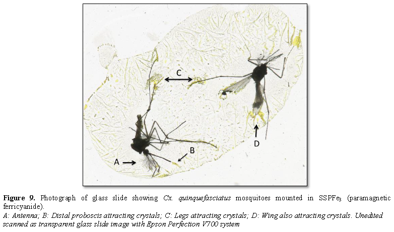 All magnified areas shown above (Figures 6-8) show the typical pattern created by the presence of bio magnetic forces attracting the paramagnetic potassium ferricyanide crystals that are no longer in solution. Adult mosquitoes of different sexes are depicted in Figure 9. Notice the difference in crystals accretion intensity in the adult insect as compared with the rapidly growing larvae stages. In the adult mosquito the proboscis shows bio magnetic activity (B in Figure 9).