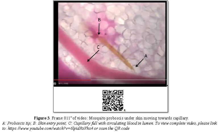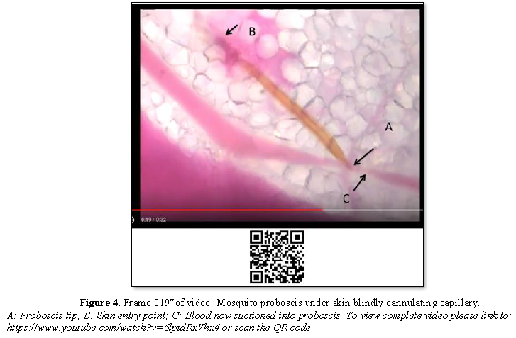 At this juncture, it is time to introduce some relevant comments as follows: As a former phlebotomist, as a rule if a blood vessel was properly cannulated blood seeping hematomas was avoided. Only recently it occurred to the author that mosquito bites are free of a side effect such as a small hematoma. Upon viewing a video-recording, courtesy to Valerie Choumet and the Pasteur Institute, Paris, it was realized that a very sophisticated guiding system is needed for the proboscis successful cannulation of small hidden capillaries (Figures 3 and 4) which proposed that bio magnetism is an essential part of the mosquito blood seeking system.