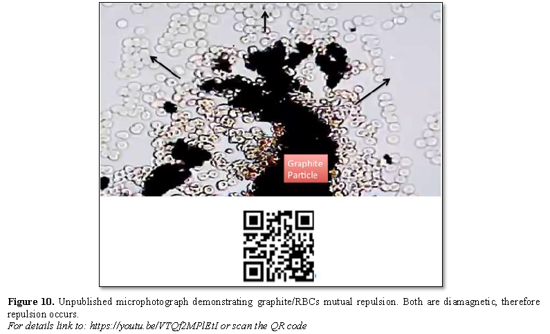 The question arises: How could bio magnetic energy be used to manufacture mosquito repellants? The image and video-recording from an in vitro experiment below could shed some light on the question by showing the role of bio magnetism as an insect repellent. In a recent article in PNAS, mosquito bite prevention was accomplished by the incorporation of graphene layers to fabric, the author’s state, “We coat this graphene little flakes, from a liquid suspension like an ink”, “It dries and forms a graphene film which you can put on fabric or on some kind of backing” [21]. Figure 10 demonstrates a bio magnetic mechanism when a graphite particle is in contact with fresh blood, repulsion of RBCs occurs. Eventually there is water evaporation and the RBCs are attracted to the particle.