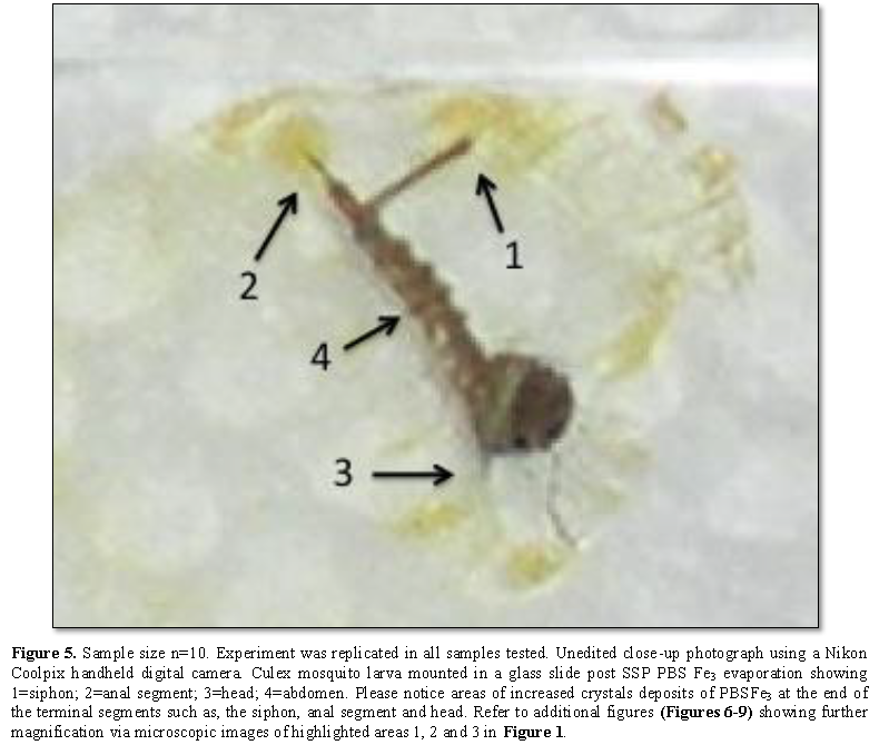 Live mosquito larvae (n=10) and adult mosquitos (n=5) were studied, all samples were placed on approximately the center of a 25 × 75 × 1 mm glass slide. One or two drops of the PBSFe3 solution were placed to cover the samples from the head to the terminal segment (n=10) in the larvae and all of the mosquito anatomy. After the liquid evaporated the SSP was then viewed in the normal mode at 10x and/or 40x magnification with a video microscope (Celestron. LCD Digital Microscope II model #44341 Torrance California USA).