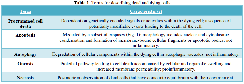 Apoptosis and necrosis comprise different modes of cell death, respectively implicated in cell withdrawal and recovery. Different types of cell death have been described according to morphologic and biochemical criteria [2]. Four basic modes of cell death have been identified following the biomedical literature, together with ad-hoc variants adapted to different situations [3].