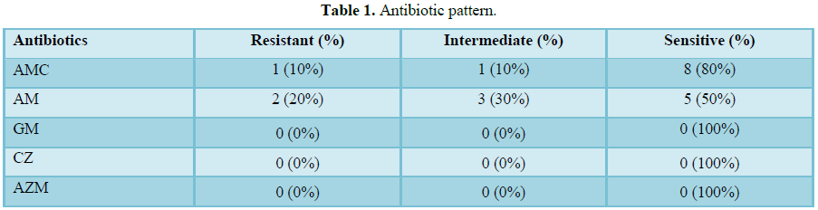 amoxiclavanic (10%), ampicillin (20%), gentamicin (0%), ceftazidime (0%) and