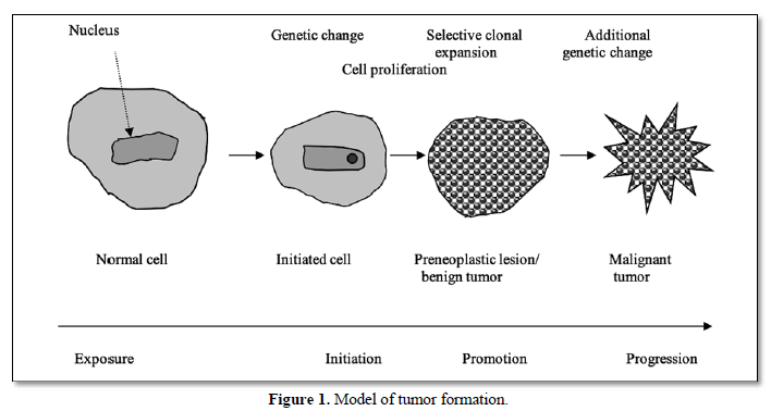 The induction of cancer by chemicals is a complex multistep process involving interactions between environmental and endogenous factors. Tumors are formed as a result of aberrant tissue growth due to loss of control mechanisms of cell division. A model traditionally used for an operational description of carcinogenesis is the initiation-promotion model. The first stage initiation requires a genotoxic event such as binding of an electrophilic xenobiotic to DNA, causing a premutagenic lesion in a single cell. After DNA replication, the premutagenic lesion may be transformed into a heritable mutation i.e., by base pair substitution. In the stage of promotion, several primarily nongenotoxic mechanisms facilitate (promote) the preferential proliferation of the initiated cell, finally resulting in tumor formation.