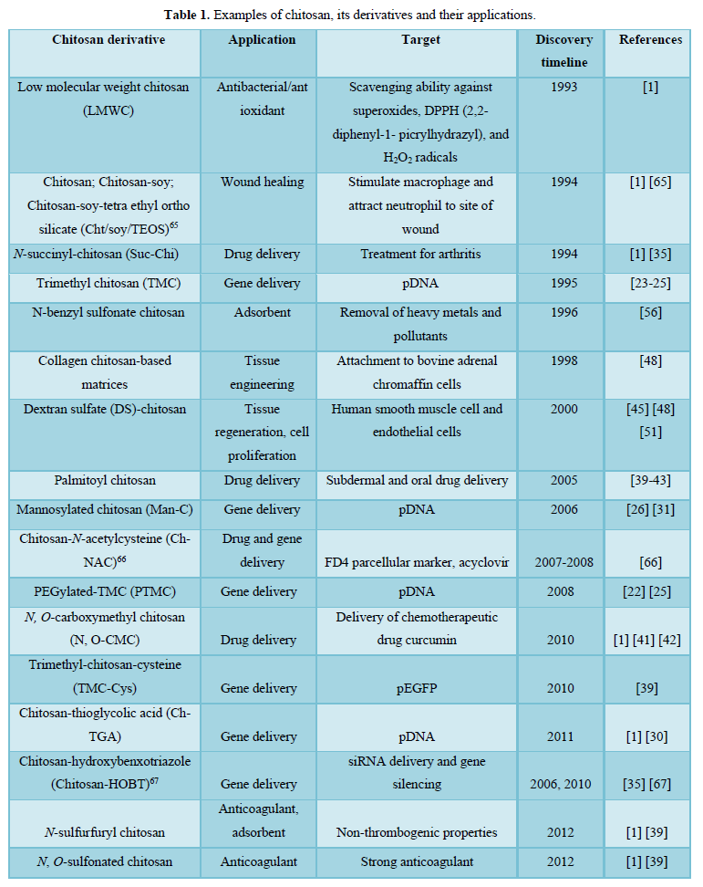 Unmodified chitosan was used for the removal of organic matter such as algae, proved to be more efficient than the following coagulating inorganic compounds (Al2(SO4)3, KAl(SO4)2, Ca(OH)2), by removing about 95% of algae from algae-containing waters [1]. Chitosan and its derivatives have also been used as encapsulating agents for proteins such as bovine serum albumin, hemoglobin, and dextran due to their high affinity for the cell membrane [40]. In addition, chitosan was used to coat PLGA (poly (lactic-co-glycolic acid)) microparticles that contain tetanus toxoid, improving the stability of the drug and PLGA by preventing degradation by lysozyme. Furthermore, it was found that the coating enhances the nasal transport of the drug due to chitosan’s mucosal adhesion or mucoadhesive properties. A study showed that a chitosan conjugation to poly (acrylic acid) (PAA), an anionic polyelectrolyte, is useful for delivery of gastric antibiotic drugs because chitosan-poly (acrylic acid (Ch-PAA) complex is stable under acidic conditions [40]. Though it is widely accepted that modified chitosans have chemical properties superior to unmodified chitosan, yet unmodified chitosan has many favorable characteristics such as biocompatibility, low cytotoxicity, biodegradability, stability when forming complexes, which are desirable qualities for effective gene delivery agent [2]. Regardless of these characteristics, unmodified chitosan has certain constraints, a main one being solubility. Chitosan is insoluble in physiological pH, thus leading to modifications that make it easier to incorporate the biopolymer into cells. In this review, the current progress using CS derivatives is discussed and summarized as well as limitations of CS and its derivative.