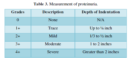 3. Proteinuria is measured by 5-point scale by dipstick (Urocolor2)- Source- American Society of Nephrology (Table 3)