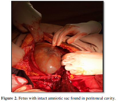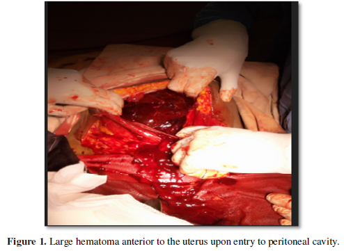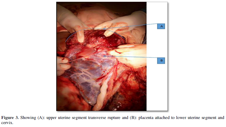 A 36 years old gravida 4 para 3 mother presented at gestational age of 38 weeks with nonspecific upper abdominal pain of 12 hours which was associated with multiple episodes of vomiting which was initially ingested matter latter became blood mixed. She had no bearing down pain or passage of liquor. She denied any vaginal bleeding or urinary symptoms. She had no prenatal care follow up. The previous deliveries were at term and at home. During her third delivery, after the delivery of baby she failed to deliver placenta and was taken to nearby primary hospital, there placenta was delivered manually and was transfused two unit of blood. Otherwise, she has no history of pelvic surgery, no history of trauma. On examination, she was pale and distressed with a PR 140/min and BP 80/60 mmHg. Abdomen was distended, tense and tender. It was difficult to feel fetal body parts. There was no uterine contraction and fetal heart beat was negative. There was fluid thrill and shifting dullness. Emergency obstetric ultrasound scan revealed fetal demise. Placenta covered cervical is totally fluid in peritoneal cavity. Hematocrit was determined and18% and blood group was O positive. Internist was also consulted and she was diagnosed to have hypovolemic shock secondary to acute blood loss secondary to perforated peptic ulcer diseases, severe anemia secondary to acute blood loss, IUFD and placenta previa totalis. She was started on resuscitation with crystalloid and took 2000ml of normal saline over one hour, transfused 2 unit of compatible blood, given omeprazole 80mg intravenously(iv), metoclopramide 10mg iv. Despite these management patient’s clinical condition was the same (still hypotensive and tachycardic) and decided for emergency laparotomy. On entry into the peritoneal cavity, a large (500 mL) hematoma was identified anterior to the uterus (Figure 1), freshly dead male fetus (weight 2800 grams) in intact amniotic sac was found in abdominal cavity (Figure 2). Placenta was found covering lower uterine segment and cervix (Figure 3). There was upper uterine segment transverse uterine rupture which was about 15 cm involving both sides uterine arteries (Figure 3A & B). There was no evidence of Couvelaire uterus and no demonstrable congenital uterine anomaly. Rest of the pelvis looked normal, with no evidence of endometriosis or adhesions. About 1.5 l hemoperitoneum sucked out and hysterectomy done. She received one unit of blood during intraoperative and one unit during the post-operative period. She was discharged 5 days after surgery.