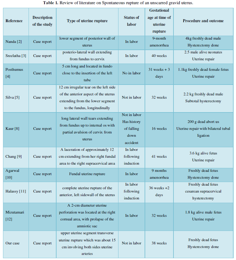 This case presentation describes a rare presentation of Spontaneous rupture of an unscarred non-laboring gravid uterus at term diagnosed upon laparotomy. Rupture of the non-laboring unscarred uterus is rare and is a potentially catastrophic event and can be life-threatening for the mother and fetus. Rupture of an unscarred uterus may be caused by trauma or congenital or acquired weakness of the myometrium. Sources of trauma include motor vehicle accidents, domestic violence and obstetric maneuvers (e.g., internal or external version, breech extraction) [3] which were not present in this case. The myometrium may be inherently weak because of a congenital disorder, such as Ehlers-Danlos type IV [4] but this was not excluded in our patient because genetic testing was not available. The myometrium may become weakened from acquired causes like protracted labor or use of strong uterotonic drugs (e.g., misoprostol), which place prolonged stress on the myometrium [3] but in our case, the patient was not in labor and she was not induced or augmented. Grand multiparty, advanced maternal age, endometriosis, arteriovenus malformation and abnormal placentation like placenta accreta, fetal macrosomia, and uterine instrumentation are all predisposing factors for uterine rupture [3]. In our case, during her third delivery she had retained placenta and it was removed manually and manual removal might have been forceful that might have caused weakening of myometrium. The uterine rupture was upper uterine segment transverse and she had placenta previa totalis with bulk anterior which might support that manual removal of placenta in the previous delivery might have caused myometrial weakening in upper uterine segment. Initial signs and symptoms of uterine rupture are typically nonspecific, which makes diagnosis difficult and sometimes delays definitive therapy [5]. But most commonly uterine rupture in the third trimester presents as sudden occurrence of severe and shearing abdominal pain with cessation of uterine contractions while vaginal bleeding and shock occurs [6]. The fetus suffers in utero distress with bradycardia as well as decreased fetal movement and the infrequent symptoms of uterine rupture are epigastric pain, shoulder pain (right sided or bilateral), abdominal distention and paralytic ileus as well as, hematuria, etc. In our case, the patient presented with upper abdominal pain and vomiting of ingested matter mixed with blood of multiple episodes, which led to the diagnosis of perforated peptic ulcer disease and delayed the diagnosis and management of uterine rupture. The basic treatment for a patient with a ruptured uterus is immediate resuscitation and surgery. At the time of exploratory laparotomy, the patient should be evaluated for possible uterine repair or hysterectomy. For young females especially those who do not have children, it is better to preserve the uterus. But in some cases, the patients often have severe tears not suitable for repair. In general, the surgical option must be individualized and should be dependent upon the type, location and extent of the rupture, as well as on the patient’s parity, the degree of bleeding, the available resources and desire to preserve her child bearing capacity [7]. If possible, repair is probably the best approach. In cases with wide bruises and contaminations, intractable uterine bleeding and multiple uterine rupture sites and longitudinal uterine rupture hysterectomy is preferable [8]. In our case, the patient was resuscitated with 2 bags of crystalloid intravenous fluid and transfused 2 unit of compatible blood before surgery, transfused one unit of blood intraoperatively and one unit of blood post operatively. Hysterectomy was done because, the rupture was upper uterine segment transverse involving both uterine arteries. A comparison of this case with other case reports published previously is presented in Table 1.
