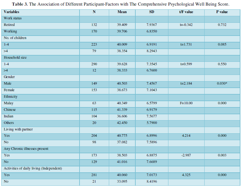 Results: In our study, a larger number of the elderly were still working as compared to the retired (170 vs 132). Majority of working elderly were males (88, 51.8%, between 60-70 years old). However, work status was not associated with psychological well-being (p value 0.732). Being physically independent, men, those of Chinese ethnicity, those having no chronic illness and those living with one’s spouse had better psychological well-being (p <0.05). Our study also confirms that those who are married and are physically independent had significantly higher feelings of well-being.