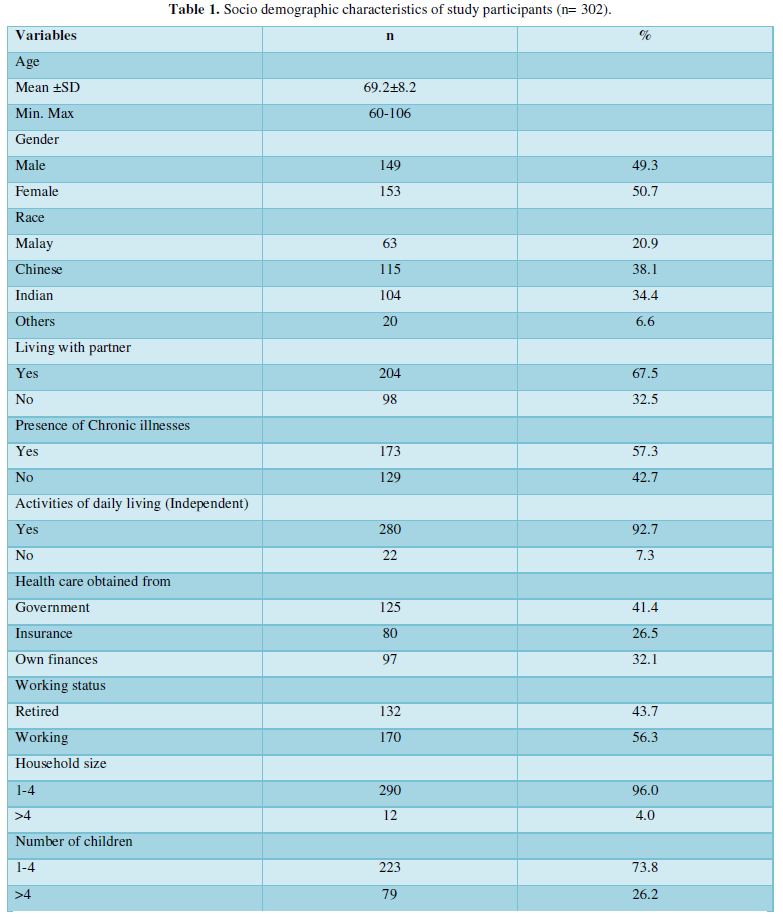 The sample size was calculated using the Openepi software based on the total number of persons aged 60 years and older in Selangor (340, 000, census 2010). The representative sample size was found to be 227 [8]. 303 people aged 60 years and over, were recruited for the study. After understanding the study and signing the consent form, the respondents completed the questionnaire.