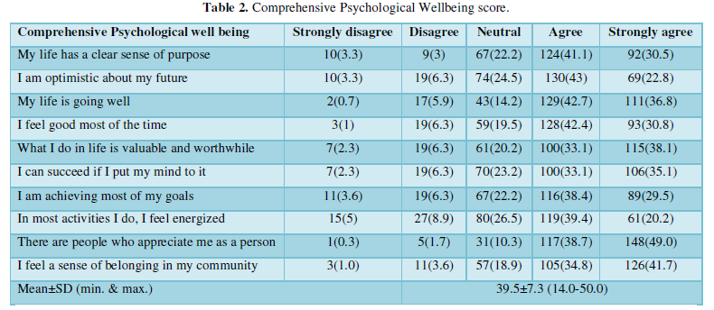 Table 2 shows the Comprehensive Psychological wellbeing score. The total score ranged between 14 to 50 with a mean value of 39.5 (SD±7.3).