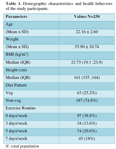 Demographic and health characteristics A total of 250 young girls participated in the study. Table 1 describes the demographic and health behaviors of the study participants. The average age in years of the study participants was 22.16±2.60, and the average weight in kilogram was 55.90±10.74. The participants had a median Body Mass Index (BMI) of 21.75 kg/m2 (19.1; 23.9), and their median height was 161cm (155 ;164). As per their BMI, the majority (n=145) of the participants fall under the normal category, 54 of them are underweight, 9 of them are at risk of being overweight while 34 falls under the category of overweight, and 8 of them come under the obese category. It was found that 74.8% of the participants had a non-vegetarian diet pattern while the remaining 25.2% had a vegetarian diet. Nearly 38.8% of the participants did not engage themselves in any kind of exercise throughout the week, 13.6% exercised 3 times a week, 29.6% exercised 5 times a week, and 18% of them were exercising every day of the week.