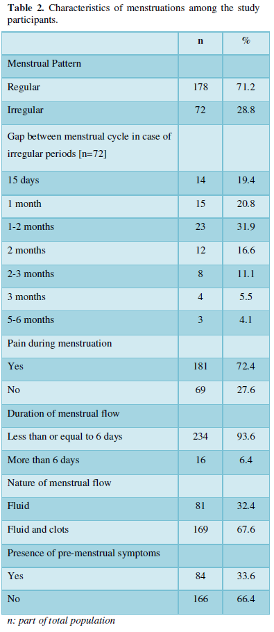 The menstrual characteristics of the participants are given in Table 2. About 71.2% of the participants stated that their menstrual cycle was regular while the remaining 28.8% stated it was irregular. In those who had an irregular menstrual cycle, the gap between their two consecutive menstrual cycles was about 15 days, 1 month, 1-2 months, 2 months, 2-3 months, 3 months, and 5-6 months for 14, 15, 23, 12, 8, 4, and 3 participants respectively. Nearly 93.6% of the participants reported having menstrual flow less than or equal to 6 days while 6.4% stated their menstrual flow lasts for more than 6 days. Pain during menstruation was reported by 72.4% (n=181) of the participants, and the remaining 27.6% (n=69) of them reported no pain during their menstrual discharge. Of the total 181 participants who reported pain during menstruation, 59 (32.59%) of them take over-the-counter (OTC) medications for the same.