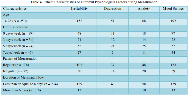 During menstruation, young girls go through a wide range of emotions. Mood swings (n=192) and irritability (n=152) were the most common symptoms of emotional distress during menstruation reported in our study. Some of the other symptoms reported by the participants in this study are anxiety (n=68) and depression (n=51). Nineteen participants revealed that they do not experience any such symptoms during their periods. Table 4 compares the different demographic and menstrual characteristics of the study participants with the various psychological factors during menstruation.