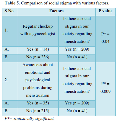 Nearly 44% (n=110) of the participants admitted to missing school due to menstrual discomfort at least once during their school days. Access to adequate menstrual aids was reported by 92.4% of them, while the remaining 7.6% claimed they do not have an adequate supply of menstrual aids all the time. Table 5 compares the perception of social stigma around menstruation with different parameters. A statistically significant result (P = 0.04) was obtained when we compared the results regarding regular gynecological check-up and their perception of social stigma regarding menstruation in our society. A similar result (P = 0.009) was also observed on comparing awareness of emotional and psychological problems during period with social stigma.