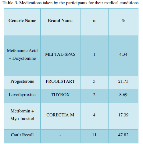 The nature of menstrual flow was mainly fluid and clots for 67.6% of the participants and only fluid for 32.4% of them. Around 33.6% of the participants in this study reported that they experienced pre-menstrual symptoms. The various pre-menstrual symptoms experienced by the participants are depicted in Figure 1. The most common symptoms reported are mood swings, low backache, headache, stomach pain, acne, breast tenderness, cramps, leg pain, and body pain. Some of the fewer common symptoms were bloating, nausea, diarrhea, white discharge, weakness, and muscle pain. In this study, polycystic ovarian syndrome (PCOS) and Thyroid disorders are the two medical conditions that were affecting 35.2% (n=88) of the participants. Thirty per cent of the participants were suffering from PCOS while thyroid disordered accounted for 4.4% (Figure 2). Out of the total 35.2% participants, 73.86% (n=65) do not take any medications for the same. From the remaining 26.13% (n=23), 11 of them couldn’t recall the name of their medications. Name of the medications used by the participants for their medical condition is given in Table 3.