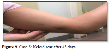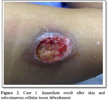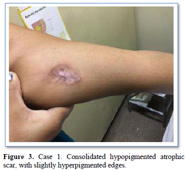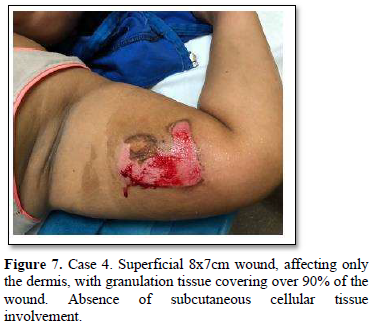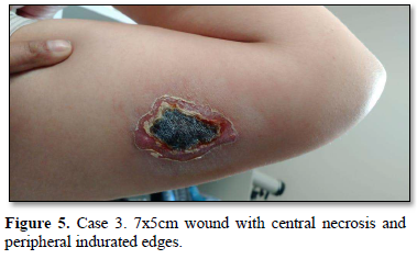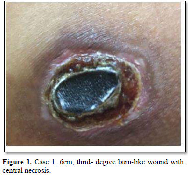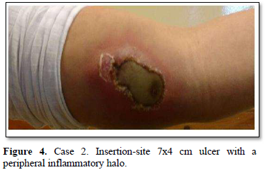Of the 995 implanted patients, five presented insertion-site necrosis (0.5%). It represented 16% of implant-related early discontinuation causes. The events were reported to the manufacturer, and to the Sexual and Reproductive Health National Program in Argentina, that reports to the ANMAT. Clinical presentation and treatment details are summarized in Table 1. Symptom onset was within 35 days of implant placement, with patients referring pain as the main symptom. An ambulatory multidisciplinary approach to patient treatment was undertaken, in cooperation with the Plastic Surgery and Infectology Departments. None showed compromise beyond the subcutaneous cellular tissue. No abscesses were found and none progressed towards gangrene or sepsis. Local debridement was performed in four patients, one of them requiring necrotic tissue removal in an operating room, under locoregional plexus nerve block. In these 4 patients, the implant was also removed. All but one received antibiotic treatment, even in the absence of pathogens in tissue cultures. Tissue biopsy indicated a severe inflammatory process, with epidermal ulcer and areas of necrosis. Time until complete healing varied from 45 days-12 months, depending on the extent of the wound.