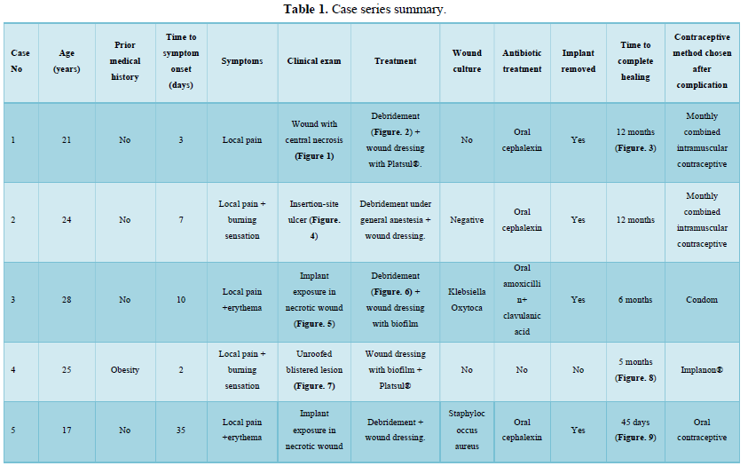 To present clinical manifestations and treatment of 5 cases of subdermal contraceptive implant insertion-site necrosis.
