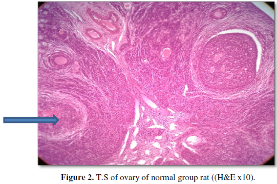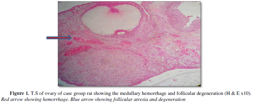 There were remarkable differences in the follicular and medullary appearance between the normal and the experimental rat. For instance, in the case group rat’s ovarian follicular atresia as well as the medullary hemorrhage was noticeable compared to the placebo which is shown in Figures 1 and 2, respectively. Similarly, the distinguishable distortion of uterine epithelium was seen in case group rats compared to the normal group rats as demonstrated in Figures 3 and 4, respectively.
