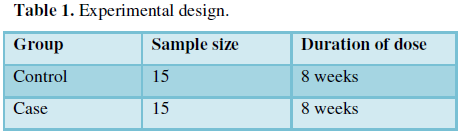 Animals were divided into 2 groups, with in each group n=15 rats, Total number n=30 (Table 1).