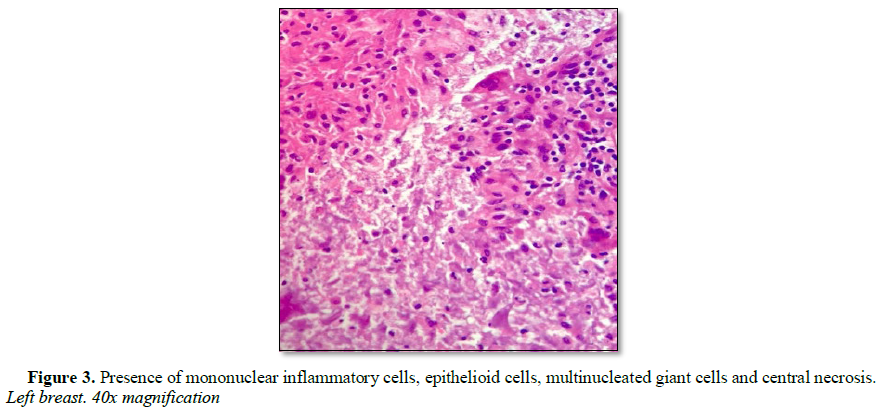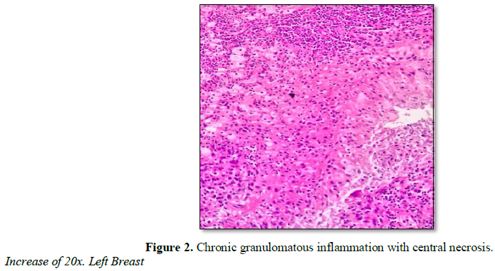 compatible with chronic granulomatous mastitis with caseous necrosis (Figures