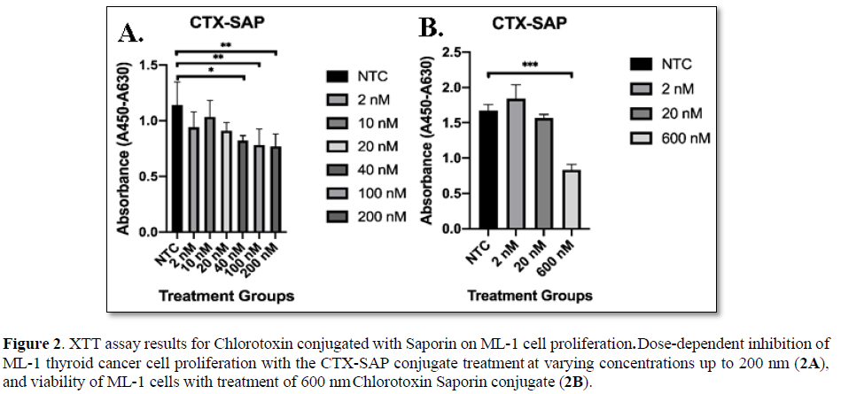 Chlorotoxin-conjugated Saporin (CTX-SAP) would inhibit the growth of aggressive thyroid cancer cell lines