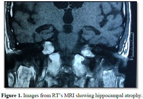 Our patient, RT, is a 72-year-old male with a presumptive diagnosis of AD, documented both in neuropsychological evaluations and imaging studies (hippocampal atrophy-Figure 1). RT completed his graduate studies as a public accountant and worked for more than 20 years at an international pharmaceutical company. His job required him to travel worldwide and learn different languages. Important aspects in his life are his love for his grandchildren, traveling, photography, listening to music and playing billiards. The first symptoms of dementia, according to both RT and his family, appeared at 66 years old and included episodes of confusion, temporary disorientation, attentional failures and a tendency to repeat the same comments and questions. Although at the beginning the clinical picture was consistent with a mood disorder, after an abrupt and unexpected retirement, it evolved into one more consistent with dementia, AD was diagnosed 5 years later. Nowadays, RT’s wife report to lack of initiative and frequent episodes of spatial disorientation, together with important alterations in episodic and autobiographical memory (particularly related to the most recent decades of his life). RT’s wife gave her signed informed consent for her husband’s participation in the study. The consent was obtained according to the terms of the Declaration of Helsinki.