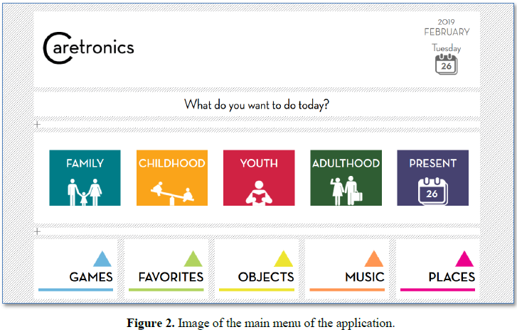 The application has two sections. The first one is observational, in which there is a timeline with photographs of the patient, his family and relevant events of his life. Photos may be organized and presented by decades or by life stages: childhood, youth, adulthood and present time. The patient looks at the photographs and has the option to either generate a memory or write a comment about them. The written comment is available for reading aloud the next time the same photo is viewed. The second section of the application allows for a more active role from the patient, as it includes games based on the patient’s life (front page ATS -Figure 2).