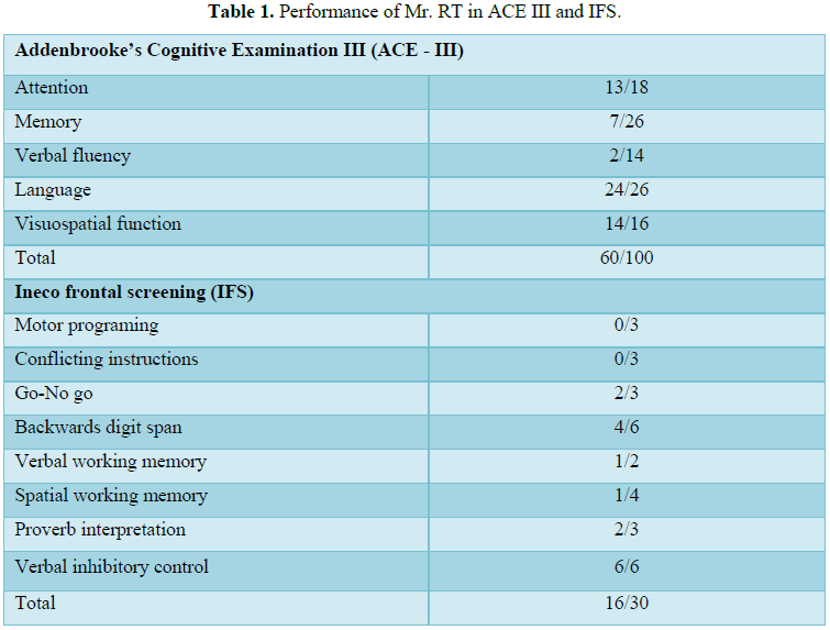 At the beginning of this research study, RT was evaluated at a general cognitive level with the Addenbrooke’s Cognitive Examination III, [32,33] which showed a general cognitive decline, particularly in episodic memory and verbal fluency tasks. RT obtains a score of 60, which is 26 points below the suggested cut-off point, denoting an important cognitive compromise. He was also evaluated with the Ineco Frontal Screening [34] also showing executive dysfunction. RT obtains a score of 16, which is 9 points below the suggested cut-off point, denoting an important compromise in executive functions (Table 1).