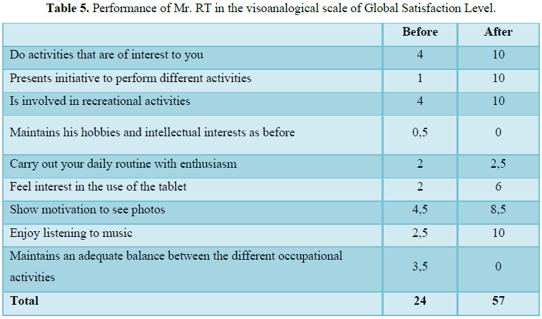 In the visual analogue scale of satisfaction level (Table 5), RT reported greater satisfaction in relation to music, more interest in the use of the tablet and greater motivation to look at photos of his family and to perform recreational activities.