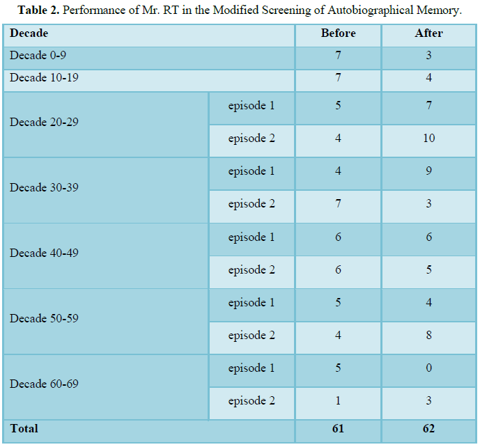 The Modified Screening of Autobiographical Memory [18] consists of the recording of autobiographical memories segmented in periods of the patient’s life. The memories are categorized according to their episodic content, taking into account the time, space, thoughts and emotions connected of each memory. The results obtained by RT in this test can be seen in Table 2.