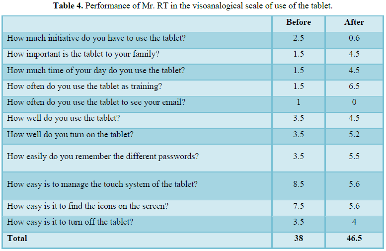 In the visual analogue scale of Tablet Management (Table 4) RT showed some improvements. The patient also reported increasingly extended period of time using the tablet and higher frequency of use of the device.