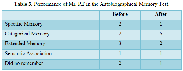 The Autobiographical Memory Test [35] is made up of 15 words that present positive, negative or neutral valence. The test requires the patient to evoke memories connected to words previously read. This memories are divided into 5 categories a) specific memories (events occurred at a specific time and place), b) extended memories: covering relatively periods of time (weeks, moth), c) categorical memory: repetitive events, d) memory of semantic association: when a specific event is not mentioned, but there is an association with a target word and e) omissions: when the patient that’s not react to the stimuli or repeats an answer. The results obtained by RT in this test can be seen in Table 3.
