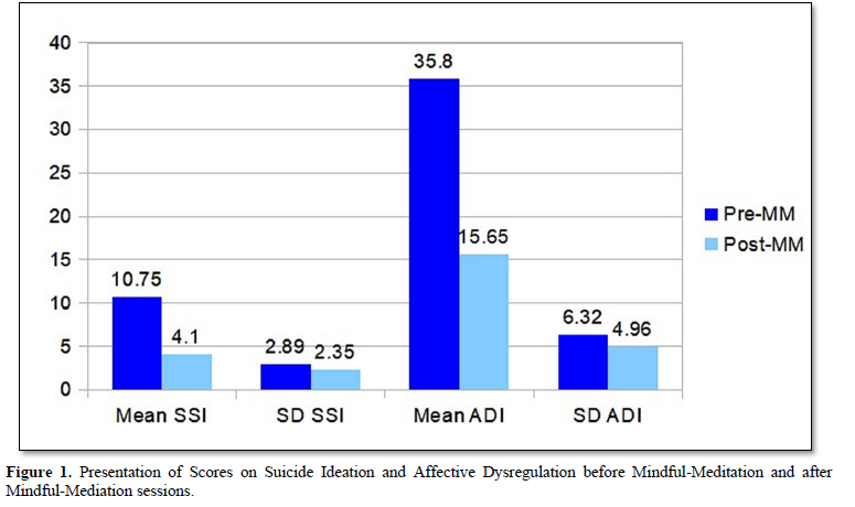 Results and Discussion: The results indicate that there is a significant effect of practicing mindful-mediation in reducing affective dysregulation and suicide ideation among psychiatry outpatients.