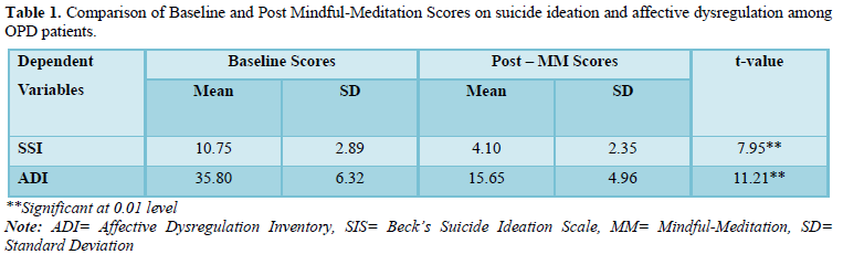 Method: The sample consisted of 20 OPD patients randomly selected from Department of Psychiatry of a reputed government hospital in Chandigarh. After a clinical interview, Affective Dysregulation Inventory (DI-A) and Beck’s Scale for Suicide Ideation were administered before providing the session of mindful-meditation and again the respective tests were administered on same patients after an interval of 40 days of practicing mindful-mediation. After this procedure, pre-intervention baseline scores were compared with post-intervention scores.