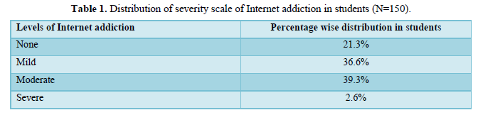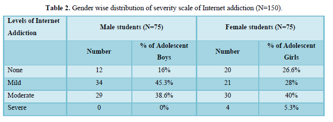 Table 1 shows approximately 36.6% of the adolescents are suffering from mild internet addiction, 39.3% are suffering from moderate internet addiction and only 2.6% adolescents are suffering from internet addiction. At the same time 21.3% adolescents shows no internet addiction.