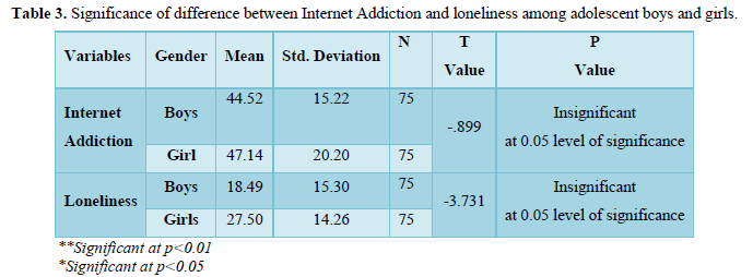 The t test was used to find the significance of difference between boys and girls on Internet addiction and Loneliness. Table 3 shows no significance of difference between adolescent boys and adolescent girls on Internet addiction (t=-0.899) and it also shows no significance of difference between adolescent boys and adolescent girls on Loneliness (t=-3.731).
