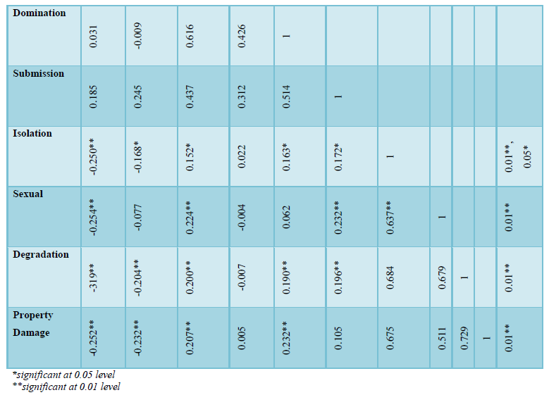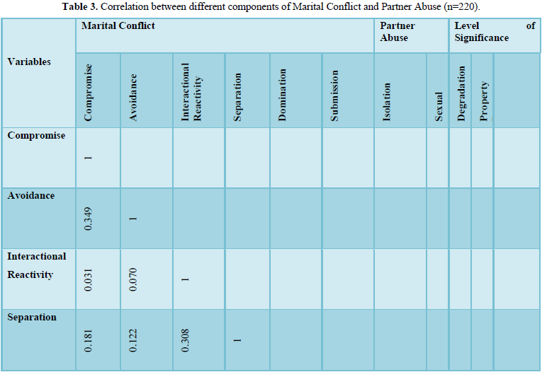 In Table 3, there is a significant relationship Marital Conflict and Partner Abuse. The correlation between Compromise and Isolation is -0.250, significant at 0.01 level; between Avoidance and Isolation is -0.168, between Interactional Reactivity and Isolation 0.152, Domination and Isolation is 0.163, Submission and Isolation is 0.172: All significant at 0.05. Moreover, on Sexual abuse and Compromise is -0.254, Interactional Reactivity and Sexual Abuse is 0.224, Sexual and Submission is 0.232 and between Isolation and Sexual Abuse is 0.637, all significant at 0.01 levels. Degradation correlated significantly correlated with Compromise, Avoidance, Interactional Reactivity, Domination and Submission, all significant at 0.01 levels. For Property Damage, there was a significant correlation with Compromise, Avoidance, Interactional Reactivity and Domination, at 0.01 levels.