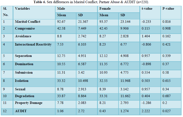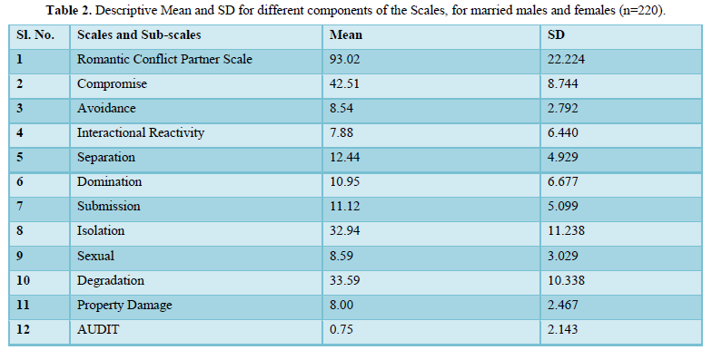 The present study was aimed at finding the correlation between Marital Conflict, Partner Abuse and Alcohol Abuse in married couples. The sample selected for the study was married couples (Male=110, Female=110) from Delhi NCR, India, who have been married for minimum of 1 year (Table 1).