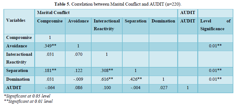 In Table 5, Alcohol Use Disorders Identification Test (AUDIT) has no correlation with the different dimensions of Marital Conflict.