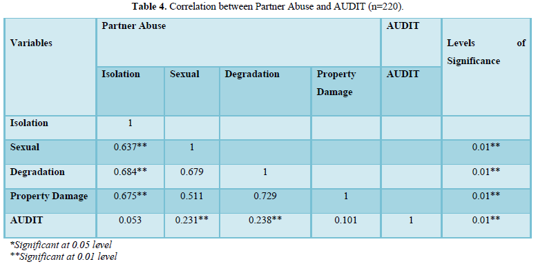 There is a significant correlation between Alcohol Use Disorders Identification Test (AUDIT) and Sexual and Degradation Emotional Abuse (Table 4). With sexual abuse, the correlation is 0.231 and for degradation abuse, the correlation is 0.238, both are significant at 0.01 levels.