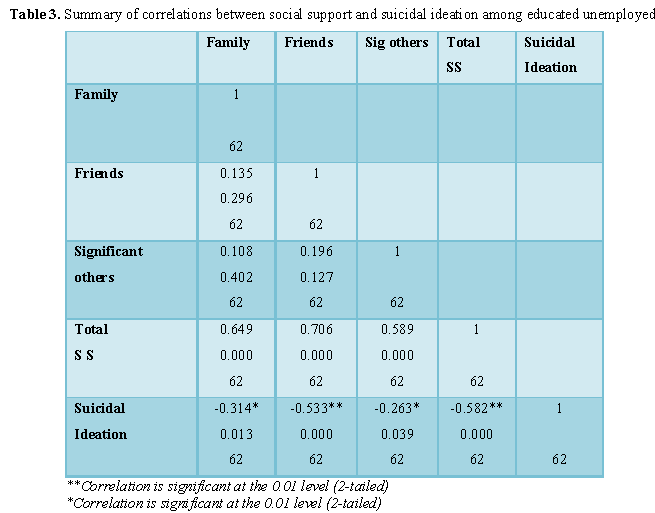 Table 3 revealed that the correlation between family, significant others and suicidal ideation was negatively correlated at 0.05 levels. The correlation between social support from friends, general social support and suicidal ideation was significant at 0.01 levels. It indicated that if the level of social support and the associated domains increases then the level of suicidal ideas decreases among the unemployed participants. It may be vice-versa as well. Similarly, studies [32] found that among young adults the lack of belongingness or lack of family support influences the suicidal ideation. The risk of attempted and completed suicide increases by the life events i.e. the death of a parent and loss of parents at early stage of life [34,40]. Suicidal ideation is also related with factors such as education, occupation, income and employment status [10,11]. Studies[19] reported that the unemployment, hopelessness, discrimination and homelessness may lead to suicidal ideation. In 26 European countries the findings of the study reported that every 1% rise in unemployment was related with 0.79% risk in suicides for age groups