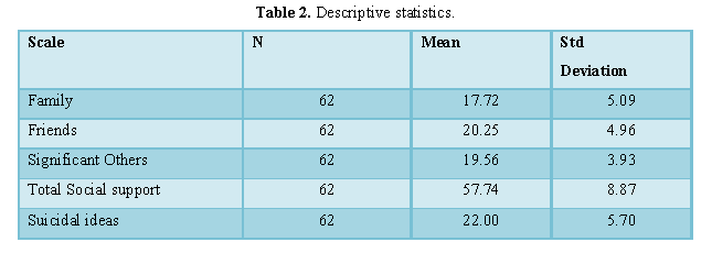 Informed consent was obtained before the administration of tools. The data sheet for demographic information, multidimensional scale of perceived social support and suicidal ideation scale were administered on sixty-two participants, age ranged from 22-35 years in Bijnor, Uttar Pradesh, India. Initially, the purpose of the study was explained to the participants. After that, the participants were given the questionnaires and proper instructions for completing the questionnaires were provided. The participants were ensured about confidentiality of information. Statistical Package for Social Science (SPSS) 21.0 version was used for data analysis. Descriptive Statistical procedures and Correlation Coefficient were carried out for data analysis.